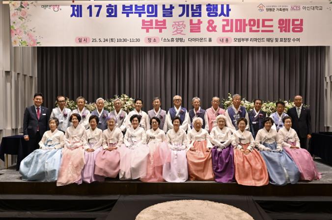 올해로 17회를 맞이한 부부의 날 기념행사는 5월 21일 부부의 날을 기념해, 각 읍·면에서 추천된 모범 부부에 대한 표창과 함께 리마인드 웨딩이 진행되며 결혼의 의미를 되새기고, 지역사회 내 건강한 가족문화 확산을 위해 기획됐다.