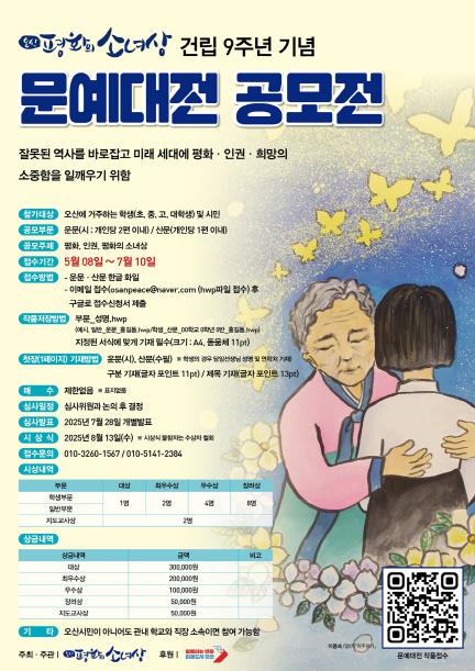 공모 주제는 '평화', '인권', '평화의 소녀상'이며, 참가자는 시(2편 이내) 또는 산문(1편)을 작성해 이메일로 제출하면 된다. 응모 후에는 웹자보 하단에 안내된 QR코드를 통해 구글 접수신청서를 함께 제출해야 한다.