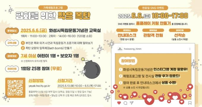 [무한뉴스=정승훈 기자] 화성특례시가 현충일을 맞아 화성시독립운동기념관에서 가족 단위 관람객을 위한 특별한 문화·체험프로그램 ‘평화를 위한 작은 폭탄’을 운영한다.