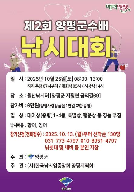 [무한뉴스=정승훈 기자] 양평군은 오는 25일 관내 월산낚시터에서 ‘제2회 양평군수배 낚시 대회’를 개최한다고 밝혔다.