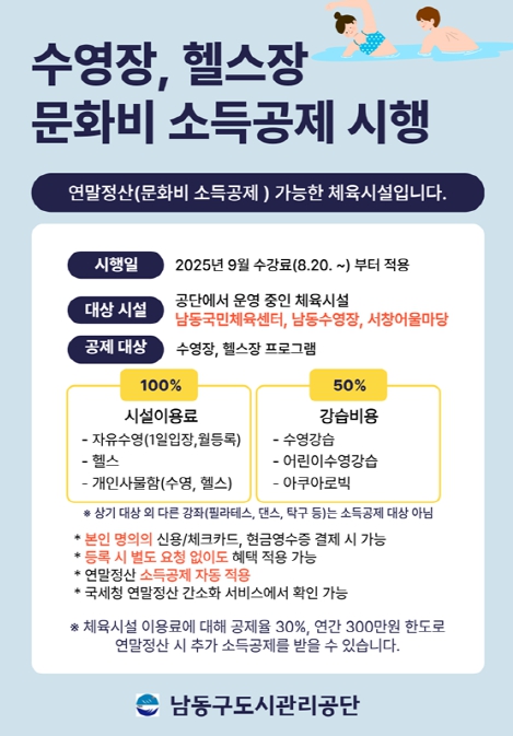 공단은 문화비 소득공제 적용을 위한 결제 시스템 구축 및 승인 절차를 완료하고, 남동국민체육센터, 남동수영장, 서창어울마당 3개 시설에 혜택을 적용한다.