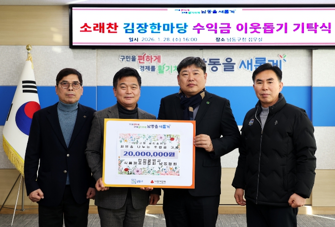 [무한뉴스=정승훈 기자] 인천시 남동구는 최근 (사)인천식품제조연합 남동구협회로부터 ‘2025년 남동구 소래찬 김장한마당’ 판매 수익금 총 2천만 원을 기탁받았다고 30일 밝혔다.