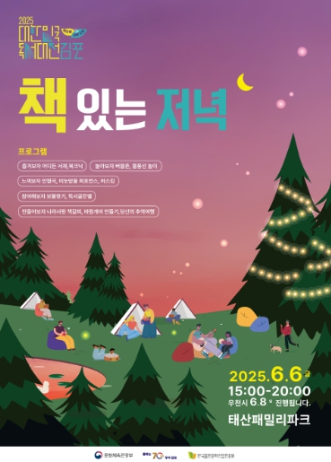[무한뉴스=정승훈 기자] 김포시는 오는 6월 6일 오후 3시부터 8시까지 태산패밀리파크에서 '책 있는 저녁' 축제를 개최한다. 이번 행사는 2025 대한민국 독서대전의 대표 프로그램 중 하나로, 도서관을 벗어나 일상 속에서 책을 자연스럽게 만날 수 있도록 기획된 야외 독서문화 축제다.