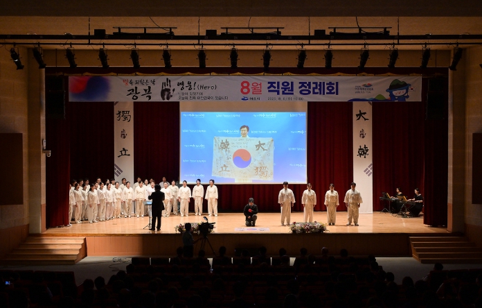 | ▲ 제80주년 광복절을 앞두고 지난 6일, 8월 직원 정례회 식전 공연으로 뮤지컬 ‘코레아 우라(대한민국 만세)’를 선보이며 순국선열과 애국지사의 숭고한 희생정신을 되새기는 뜻깊은 시간을 마련했다. |