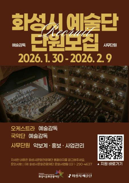 [무한뉴스=정승훈 기자] (재)화성시문화관광재단은 2026년 ‘화성시 예술단’을 이끌어갈 예술감독과 사무단원을 모집한다.