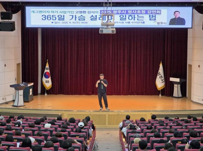 [무한뉴스=정승훈 기자] 광주시는 지난 16일 오후 7시 시청 10층 수어장대홀에서 400여 명의 시민이 참석한 가운데 방송인·작가·사업가로 활동 중인 고명환 강사를 초청해 ‘365일 가슴 설레며 일하는 법’을 주제로 한 ‘2025년 제2회 명사 초청강연회’를 개최했다.