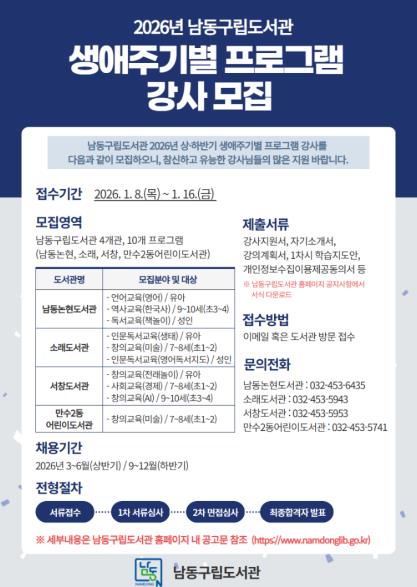 [무한뉴스=정승훈 기자] 인천시 남동구 구립도서관은 3~12월까지 운영하는 ‘2026년 상·하반기 생애주기별 프로그램’에 함께 할 프로그램 강사를 공개 모집한다고 12일 밝혔다.