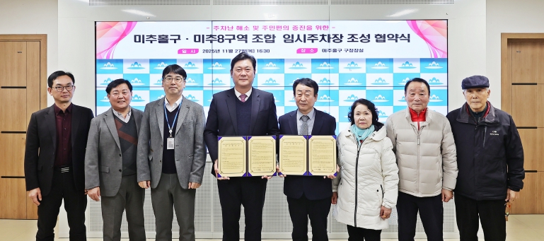 [무한뉴스=정승훈 기자] 인천 미추홀구는 지난 27일 구청장실에서 미추8구역 주택재개발정비사업 조합과 ‘임시주차장 조성 협약’을 체결했다.