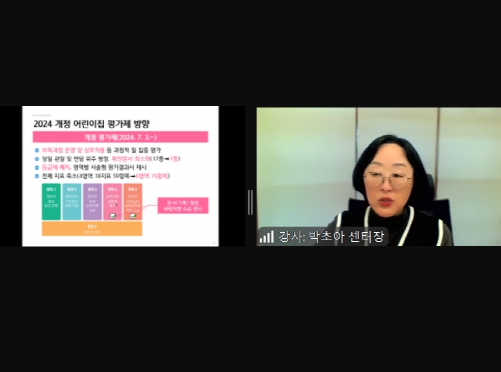 이번 교육은 의무평가제 지표에 따른 상호작용 빛 보육과정 문서 작성 시 유의할점을 안내하여 교사의 역량을 강화하고, 평가 준비과정을 지원하는데 초점을 맞추었다.