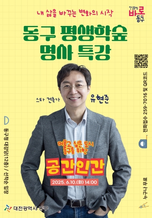 [무한뉴스=정민정 기자] 대전 동구는 다음 달 10일 오후 2시 동구청 대강당에서 2025년 평생학숲 명사 특강 ‘유현준의 공간 인간’을 개최한다고 27일 밝혔다.