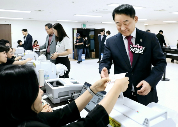 ▲ 29일 서구청 사전투표소에서 투표 중인 서철모 서구청장