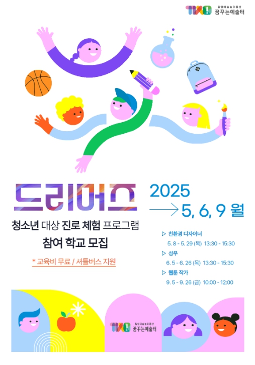 프로그램은 △5월, 친환경 디자이너를 주제로 한 업사이클링 소품 제작 △6월, 성우 체험을 통한 공연장 안내 멘트 녹음 및 실습 △8월, 청소년 연극제와 연계한 특수 분장 교육 △9월, 웹툰 작가의 업무 과정을 바탕으로 한 창작 실습 등으로 구성된다.