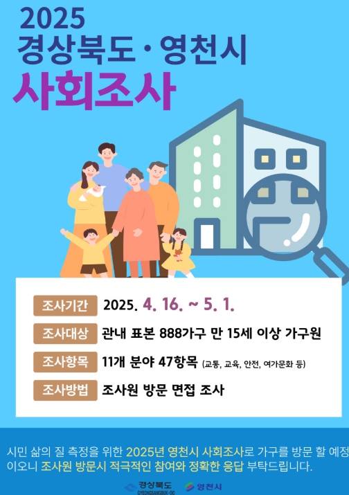 [무한뉴스=최진수 기자] 영천시는 16일부터 5월 1일까지 ‘2025년 경상북도 및 영천시 사회조사’를 실시한다고 밝혔다.