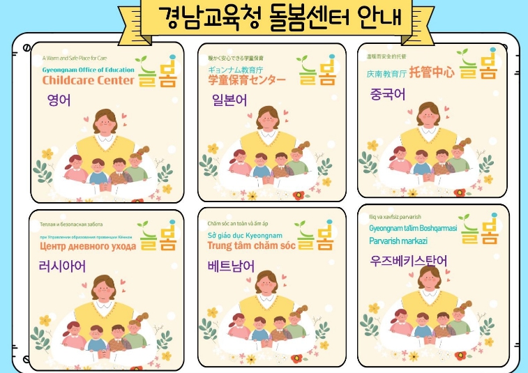 [무한뉴스=최진수 기자] 경상남도교육청은 다문화 가정과 외국인 학부모가 돌봄 서비스를 쉽게 이해할 수 있도록 경남교육청 돌봄센터 ‘늘봄’ 안내자료를 6개 국어로 제작해 배포했다. 지원 언어는 영어, 일본어, 중국어, 베트남어, 러시아어, 우즈베키스탄어이다.