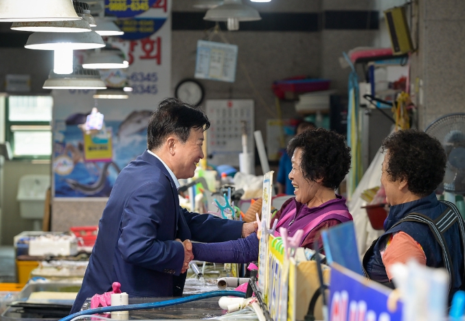 | ▲ 정기명 여수시장이 지난 22일 추석 명절을 앞두고 관내 전통시장을 찾아 민생회복 소비쿠폰 조기 사용을 독려하고 소상공인을 격려했다. |
