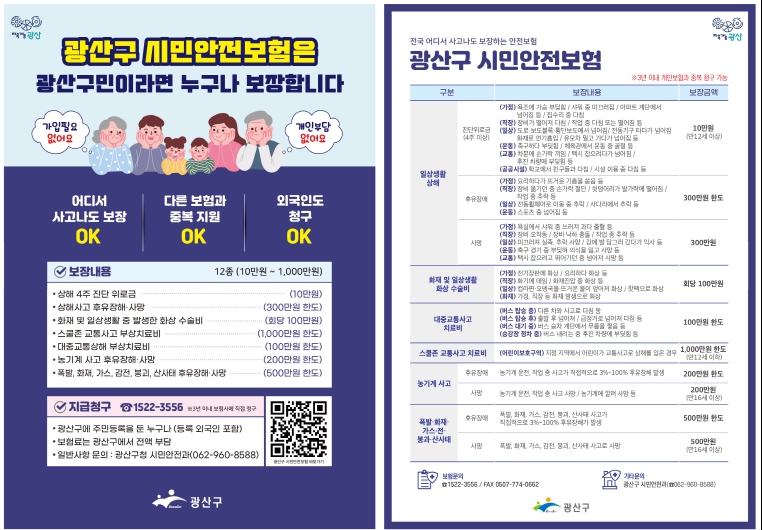 시민안전보험은 광산구에 주민등록이 된 시민이라면 누구나 자동으로 가입되며, 외국인 주민도 포함된다. 가입이나 비용 부담 없이 개인보험과 중복 청구도 가능하다.