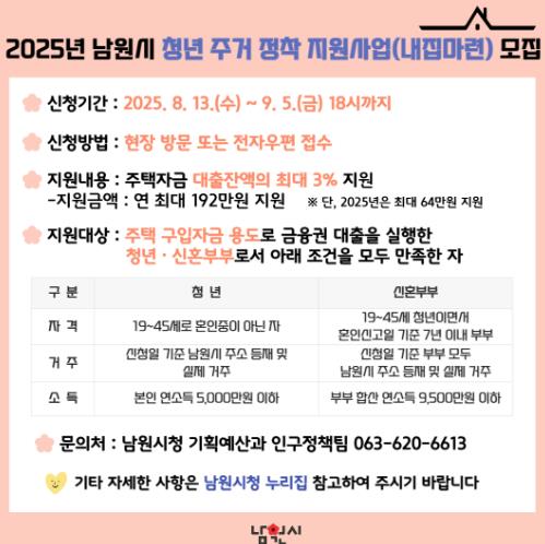 [무한뉴스=정민정 기자] 남원시가 청년과 신혼부부 주택 마련에 도움을 주기 위해 올해부터 내 집 마련 지원 정책을 추진한다.