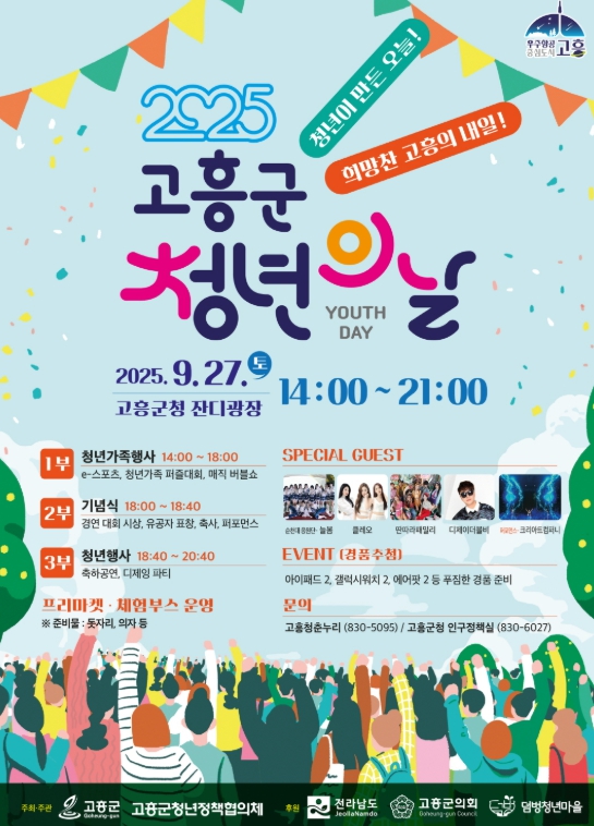 [무한뉴스=정민정 기자] 고흥군은 오는 9월 27일 고흥군청 잔디광장에서 ‘2025년 고흥군 청년의 날’ 행사를 개최한다고 밝혔다.