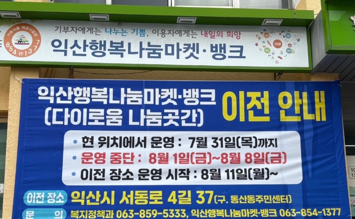 익산시는 익산 행복나눔 마켓뱅크와 다이로움 나눔곳간이 오는 8월 1일부터 8일까지 운영을 일시 중단하고 이전 작업에 들어간다고 24일 밝혔다.