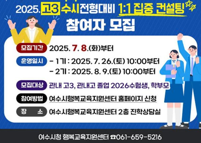 [무한뉴스=정민정 기자] 여수시는 고3 수험생과 학부모, 관내 고등학교를 졸업한 2026년도 대입 수험생 등을 대상으로 ‘2026 대입 수시전형 대비 1:1 집중 컨설팅’을 운영한다고 밝혔다.