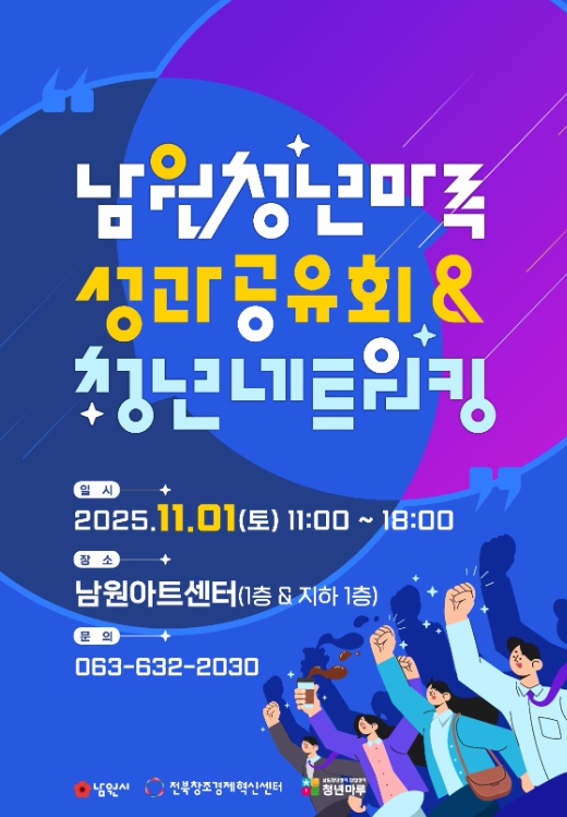 [무한뉴스=정민정 기자] 남원시는 청년활동 거점공간인 ‘청년마루’의 한 해 성과를 시민과 함께 공유하고, 지역 청년들이 서로 소통하며 새로운 가능성을 모색하는 '2025 남원 청년마루 성과공유회 · 청년네트워킹 데이'를 11월 1일남원 아트센터에서 개최한다.