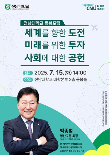 [무한뉴스=정민정 기자] 전남대학교가 지역과 대학이 함께 성장하는 방향을 모색하는 열린 강연 시리즈 ‘용봉포럼’을 처음으로 연다. 첫 번째 연사로는 세계한인경제무역협회(World-OKTA) 제22대 회장을 지낸 박종범 회장이 초청돼, 글로벌 경제인으로서의 도전과 성공, 기업의 사회적 책임에 대한 통찰을 공유할 예정이다.