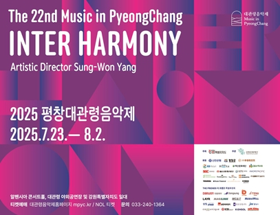 - 제22회 평창대관령음악제는 예술감독 양성원의 지휘 아래 ‘Inter Harmony(조화의 나눔: 경계를 넘는 음악적 영감)’을 주제로 7월 23일부터 8월 2일까지 11일간 평창 알펜시아를 중심으로 도내 전역에서 개최된다.