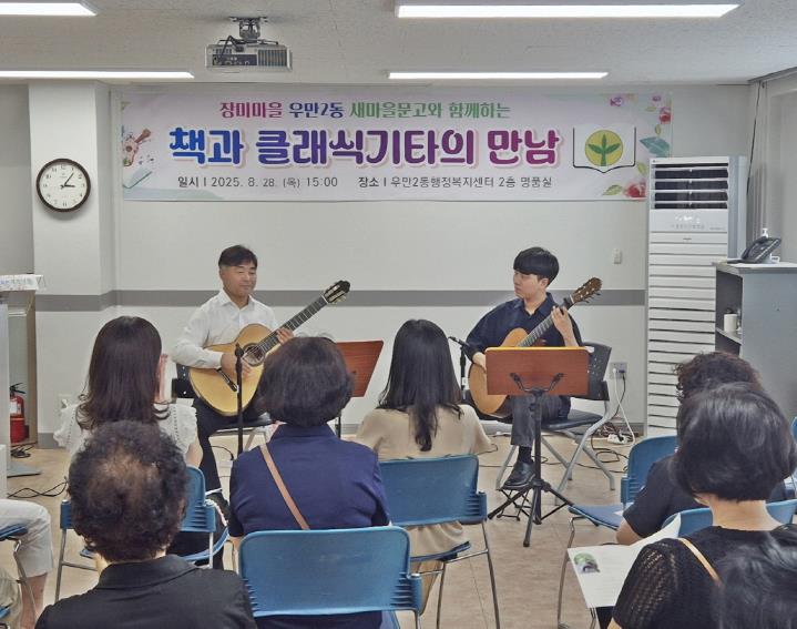 [무한뉴스=양현명 기자] 수원시 팔달구 우만2동 새마을문고는 지난 28일 '책과 클래식기타의 만남' 행사를 진행했다.