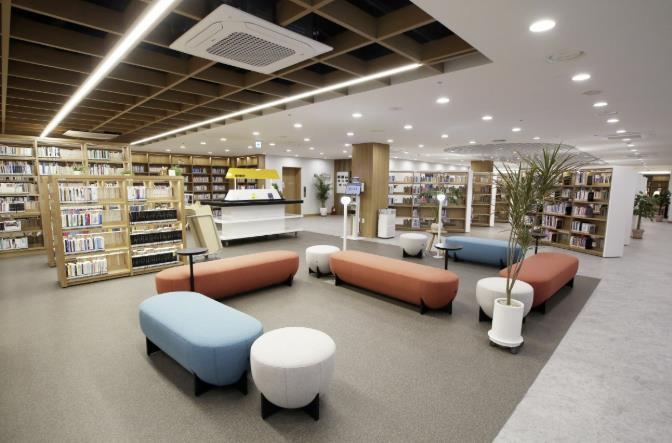 특히, 기존의 높은 밀집 서가로 인해 좁고 어두운 공간을 개방형의 낮은 서가와 세련된 테이블·소파 등을 배치해 개선하고, 여기에 격자 천장·조명 시공을 더해 밝고 현대적인 분위기의 도서관으로 탈바꿈시켰다.