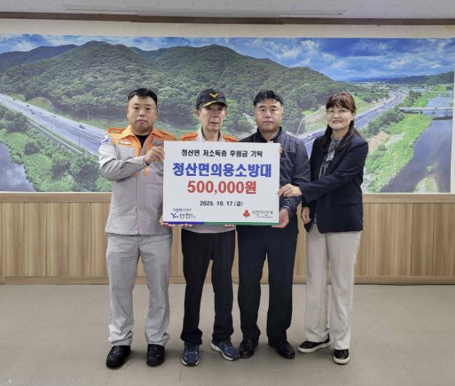 [무한뉴스=정승훈 기자] 청산면의용소방대은 지난 17일 청산면행정복지센터를 방문해 지역사회 저소득층에게 따뜻한 온기를 나누고자 현금 50만 원을 기탁했다.