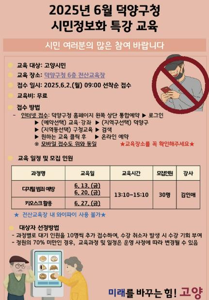 6월 시민정보화교육은 △디지털 범죄 예방 △키오스크 활용 과정으로 구성됐다. 디지털 범죄 예방은 은 6월 13일·20일, 키오스크 활용은 6월 27일 덕양구청 6층 전산교육장에서 진행된다.