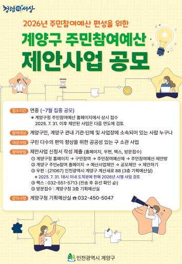[무한뉴스=정승훈 기자] 인천광역시 계양구는 7월 31일까지 ‘2026년 본예산 편성을 위한 계양구 주민참여예산 제안사업 집중 공모를 실시한다고 밝혔다.