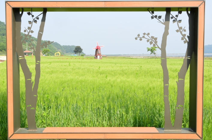 붘녁이 보이는 넓은 정원에 빼곡히 심어진 청보리들이 장관을 이루고 있으며, 곳곳에 마련된 감성적인 포토존과 어우러져 이국적인 풍광을 자아낸다.