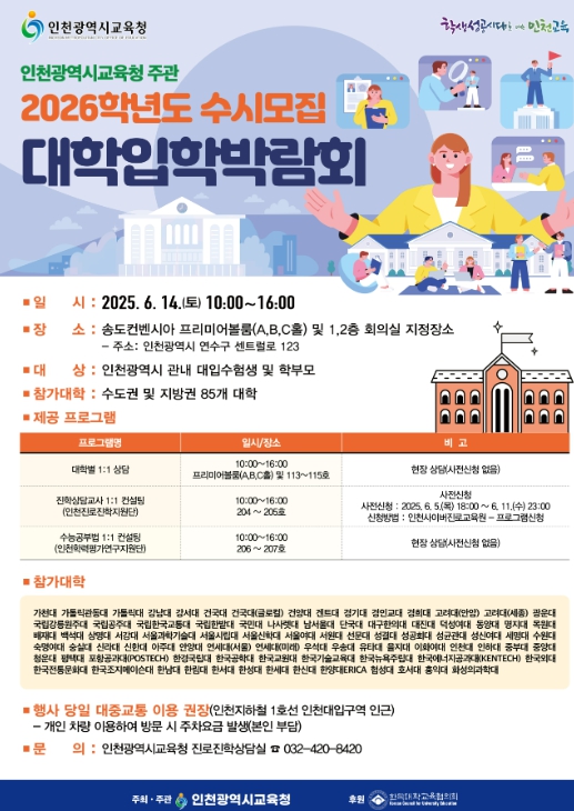 [무한뉴스=정승훈 기자] 인천광역시교육청은 오는 6월 14일 송도컨벤시아에서 관내 대입 수험생과 학부모를 대상으로 ‘2026학년도 수시모집 대학입학박람회’를 개최한다.