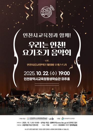 [무한뉴스=정승훈 기자] 인천광역시교육청평생학습관은 10월 22일 오후 7시 평생학습관 미추홀에서 인천시립교향악단의 ‘인천시교육청과 함께! 우리는 인천! 요기조기 음악회’를 개최한다고 밝혔다.