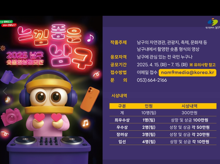 [무한뉴스=최진수 기자] 대구 남구청이 남구의 다채로운 매력을 널리 알리기 위해 ‘느낌좋은 남구’라는 주제로 숏폼 영상 공모전을 개최한다.