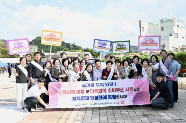 [무한뉴스=정민정 기자] 예산군은 추석 명절을 맞아 지난 9월 30일 예산시장에서 최재구 예산군수와 소비자교육중앙회 예산군지회(회장 고순옥) 회원 등 30여명이 참석한 가운데 전통시장 장보기와 물가안정을 위한 캠페인을 전개하고 민생회복 소비쿠폰 사용을 홍보했다.