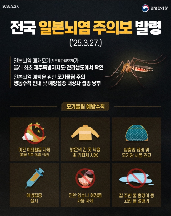 작은빨간집모기가 처음 확인되면 전국적으로 ‘일본뇌염 주의보’를 발령하는데, 올해는 3월 27일 제주도와 전라남도 지역에서 처음 확인되어 전국에 주의보가 발령된 상황이다.