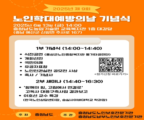 [무한뉴스=정민정 기자] 충청남도노인보호전문기관(관장 정미선)은 제 9회 노인학대예방의 날을 맞이하여 오는 6월 13일 충청남도농업기술원 대강당에서 기념식을 개최한다.