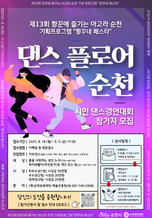 [무한뉴스=정민정 기자] 순천문화재단은 제13회 항꾼에 즐기는 아고라 순천 사업 일환으로 진행되는 ‘항꾸네 페스타’시민 댄스경연대회 '댄스플로어 순천' 의 참가자를 오는 8월 18일부터 9월 5일까지 모집한다고 밝혔다.