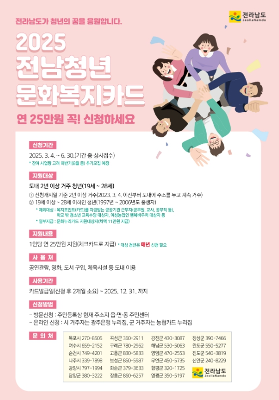 ‘전남청년 문화복지카드’는 농협카드 누리집(온라인) 또는 주소지 읍·면 행정복지센터를 통해 신청할 수 있으며, 지난해 지원을 받은 청년도 올해 다시 신청해야 지원금을 받을 수 있어 각별한 주의가 필요하다.