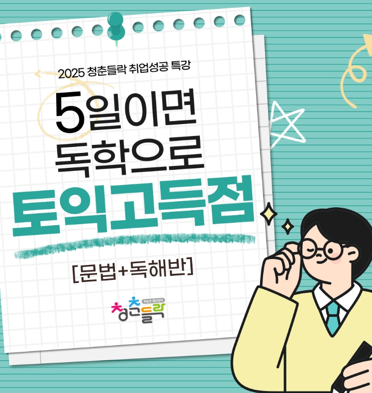 토익 문법·독해 수업은 취업을 준비하는 청년들의 외국어 역량 강화를 위한 과정으로, 문법 이론과 독해 중심의 강의, 실전 문제 풀이 등을 통해 효율적인 점수 향상을 목표로 한다. 수업은 6월 28일 토요일부터 7월 26일 토요일까지 매주 토요일 오후 2시부터 총 5회에 걸쳐 진행한다.
