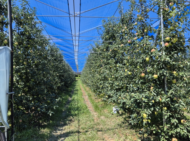 [무한뉴스=정민정 기자] 무주군이 기후변화에 선제적으로 대응하고 과수 농가의 안정적인 영농을 지원하기 위해 '다목적 햇빛 차단망 보급'을 완료했다. 햇빛 차단망을 설치한 곳은 여름철 폭염에 취약한 홍로 품종의 과원 2곳(0.8ha)으로 총사업비 1억 원이 투입됐다.