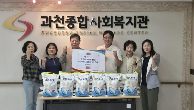 | ▲ 과천시 별양동 체육회-과천종합사회복지관 햅쌀 기부 단체사진 |
