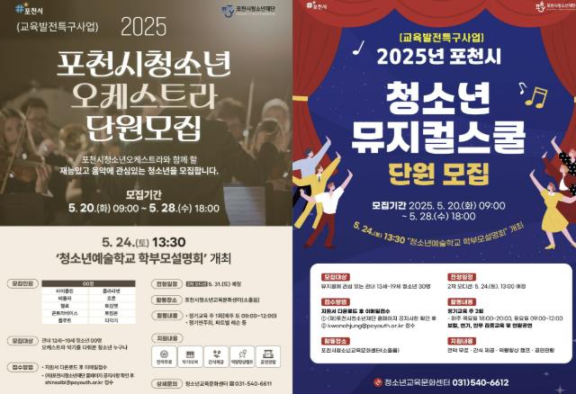 아울러 재단은 오는 5월 23일까지 오케스트라 분야 악기 파트 강사 9명과 뮤지컬스쿨 보컬 강사 1명을 공개 모집한다. 자세한 내용은 포천시청소년재단 누리집을 확인하면 된다.