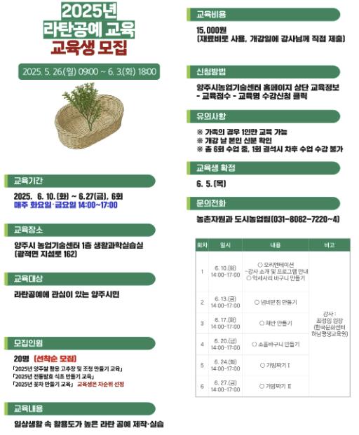 참가자는 교육비 일부로 자부담금 1만5천원을 납부해야 하며, 신청은 5월 26일 오전 9시부터 6월 3일 오후 6시까지 양주시 농업기술센터 홈페이지 상단 ‘교육정보’에서 선착순으로 접수할 수 있다.
