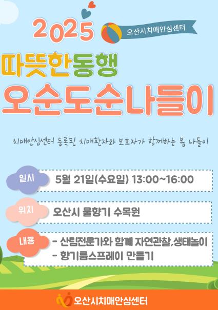 ‘따뜻한 동행, 오순도순 나들이’는 치매환자 및 가족을 대상으로 지역사회 내 산림자원을 활용하여 관내 오산시 물향기 수목원에서 산림체험 프로그램을 제공하여 상호간 스트레스를 해소하고 일상에서 재충전의 기회를 제공하는 프로그램이다.
