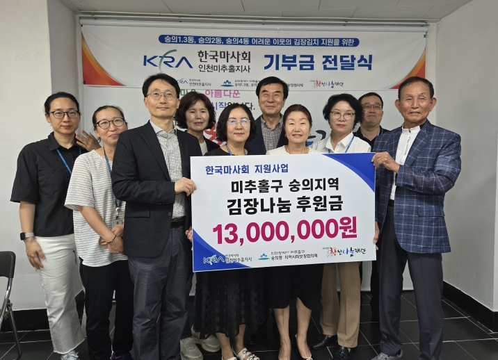 [무한뉴스=정승훈 기자] 한국마사회 인천미추홀지사(지사장 조영진)는 미추홀구 숭의1·3동, 숭의2동, 숭의4동 일대 취약계층을 지원하기 위해 김장 나눔 후원금 1,300만 원을 학산나눔재단에 전달했다고 23일 밝혔다.