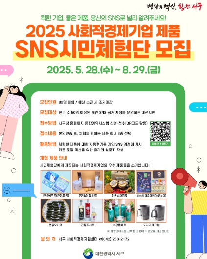 [무한뉴스=정민정 기자] 대전 서구는 ‘2025년 사회적경제기업 제품 SNS 시민체험단’ 참가를 희망하는 인원 80명을 이달 28일부터 공개 모집한다.