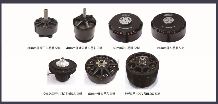 현재 드론용 모터를 주력으로 하면서 높은 출력밀도(중량 대비 출력을 나타내는 지표)를 극대화할 수 있는 대용량 제품 개발을 위하여 유인 드론용 모터 개발 및 제어기 병행 개발에도 집중하고 있다.